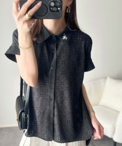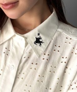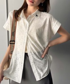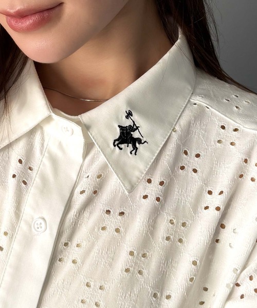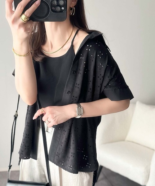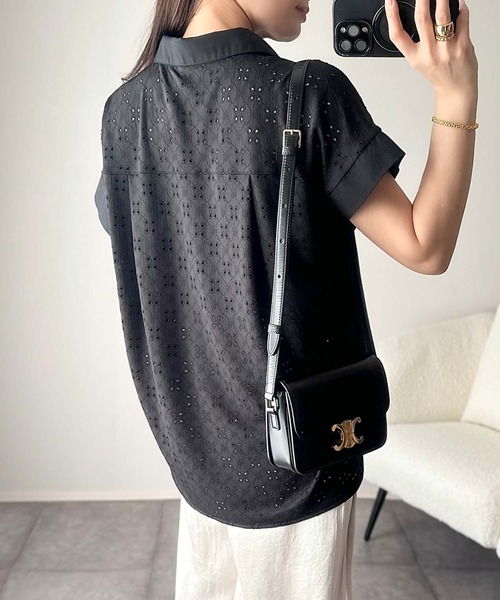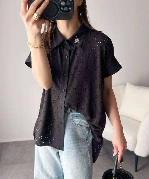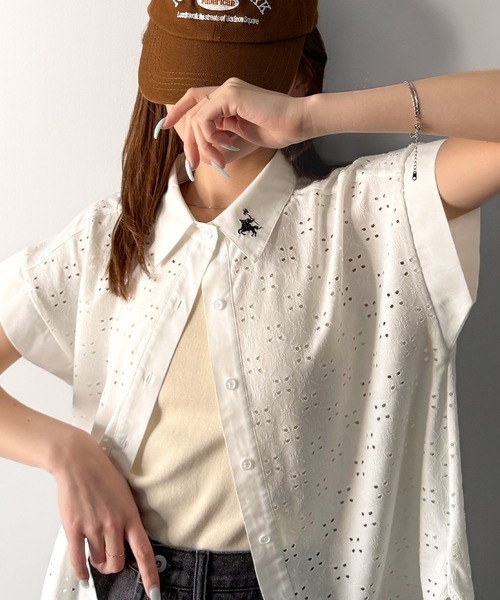 参考商品名:さっと羽織ってきれいめカジュアル。ワンポイント刺繍アイレット柄レースフレンチスリーブシャツ